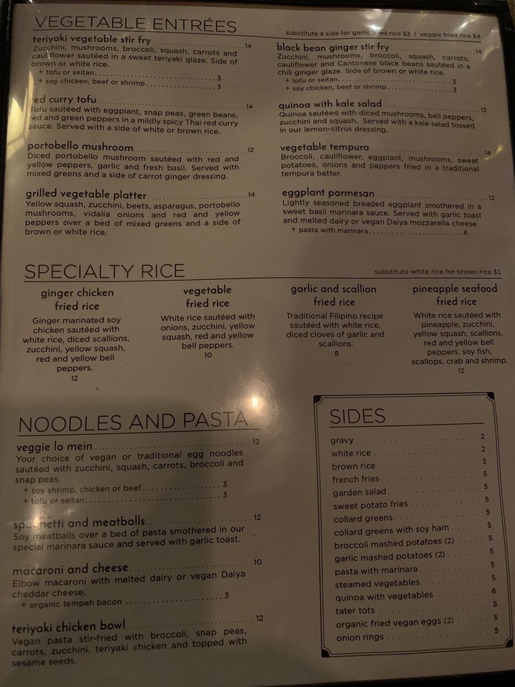 Zucchini, mushrooms, broccoli, squash, carrots, cauliflower and Cantonese black beans sauteed in a chili glaze. Side of white or brown rice.